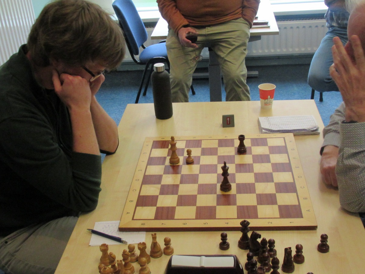 Na een spannende strijd heeft ons KNSB team het eerste punt behaald. We hadden deze keer een behoorlijk team bij elkaar. Op papier waren de beide teams redelijk aan elkaar gewaagd, dus de kans eindelijk eens punten te halen was nu groter dan ooit. Afgelopen dinsdag was de wedstrijd op bord 8 al vooruit gespeeld. Dat eindigde in remise. We gingen niet zo goed van start. Regobert raakte in de opening min of meer de kluts kwijt en de stelling verslechterde per zet. Na anderhalf uur spelen was dit uit. Ook Paul, die altijd tekent voor een bordpunt, liet zich verrassen. Hij kon kiezen tussen een kwaliteit verliezen of in een matnet komen. Hij koos, tot zijn grote teleurstelling, voor het laatste. Maar het tij keerde. Op de alle borden stonden we er goed voor, behalve bij John. Patrick wist zich aan een remise te ontworstelen en won de partij met ongelijke lopers. Henk, die zich met een dubieuze rokadezet in de problemen had gebracht, opende een heel effectieve aanval op de damevleugel. Na dameruil, uitgelokt door de tegenpartij, was het snel bekeken. Art speelde heel degelijk. deed geen gekke dingen en transformeerde zijn stelling naar een toreneindspel met betere pionnen. John had inmiddels gecapituleerd. Zodat de stand 3,5-3,5 werd. Dat was om ca 17.00 uur. In de laatste partij moest Wouter het winnende punt inhalen. Het leek er op dat dat ging lukken. Een toreneindspel met twee pionnen meer op elke vleugel een. Maar dat was niet gemakkelijk. Telkens als je denkt, nu gaat het lukken dan kwam de tegenstander met de juiste tegenzet. Tot een minor-promotie toe. Uiteindelijk werd het Toren-tegen-Paard eindspel een remise. We waren inmiddels wel anderhalf uur verder…..