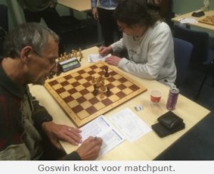 Nu was het aan Goswin om een matchpunt binnen te slepen door een eindspel remise te houden. Goswin had een loper en een pion, zijn tegenstander een paard en 2 pionnen. Deze had kunnen winnen door zijn vrijpion op te spelen. Slaan van deze pion zou dan tot verloren pionnen-eindspel leiden. Volgens eindspel-DB had wit op dat moment 8 zetten die de winst in stand hielden, 3 zetten die zelfs tot verlies zouden voeren (wit geeft paard weg) en slechts 1 zet die remise op zou leveren. Gelukkig voor ons koos de witspeler juist deze zet (55. Pc4-e5+, zie foto – 55. d5-d6 had gewonnen), waarop er snel een remise-stelling op het bord verscheen. Wit hield uiteindelijk 1 pion over met de zwarte koning ervoor, dus remise overeengekomen. (4 – 4)