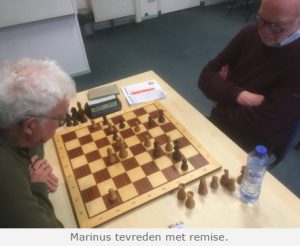 Marinus had een eindspel met een kwaliteit meer, maar zijn toren was beperkt in ruimte t.o.v. het loperpaar van de tegenstander. Deze had bovendien ver opgerukte pionnen. Marinus wilde remise aanbieden, maar teamleider Jos zei hem door te spelen. Uiteindelijk werd toch (gelukkig!) remise overeengekomen. Hij kon de partij eigenlijk ook niet winnen – sterker nog, Marinus stond op verlies. (3 – 3)